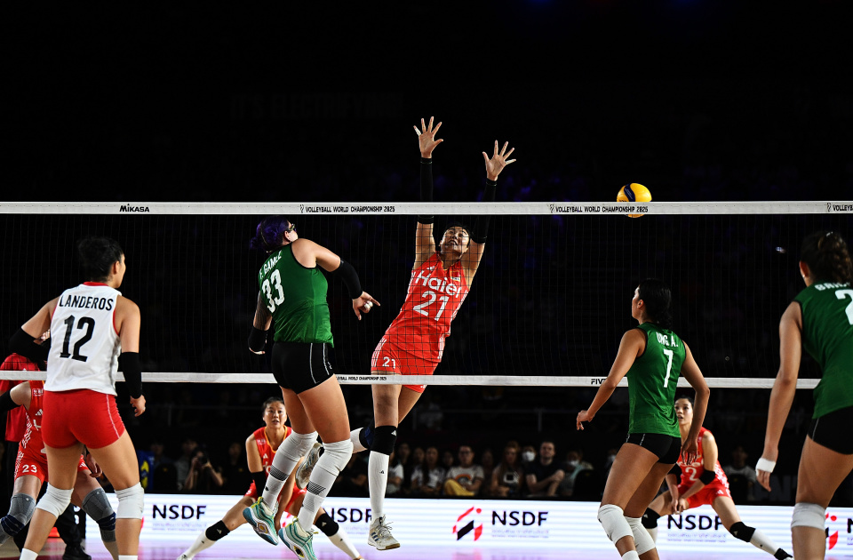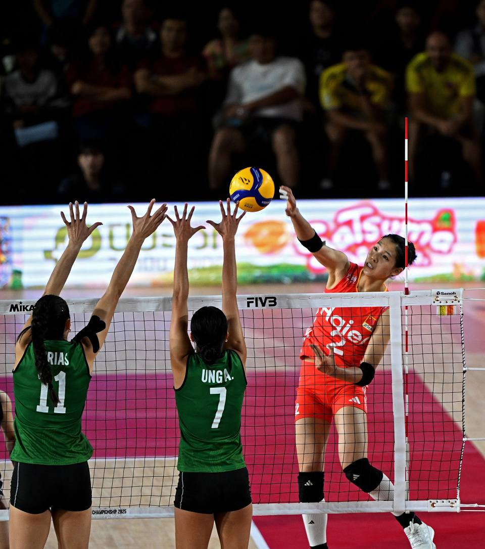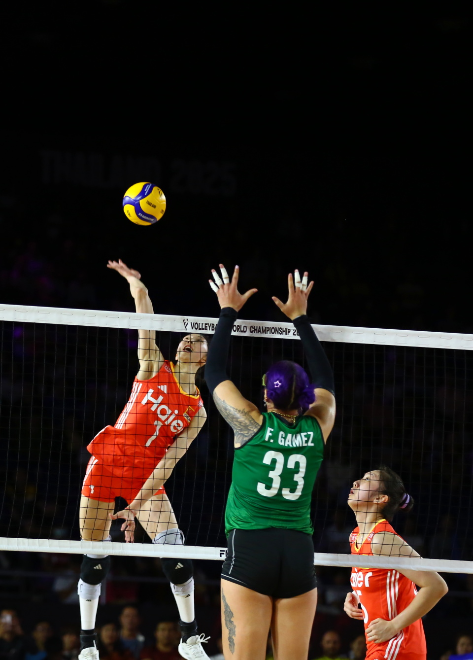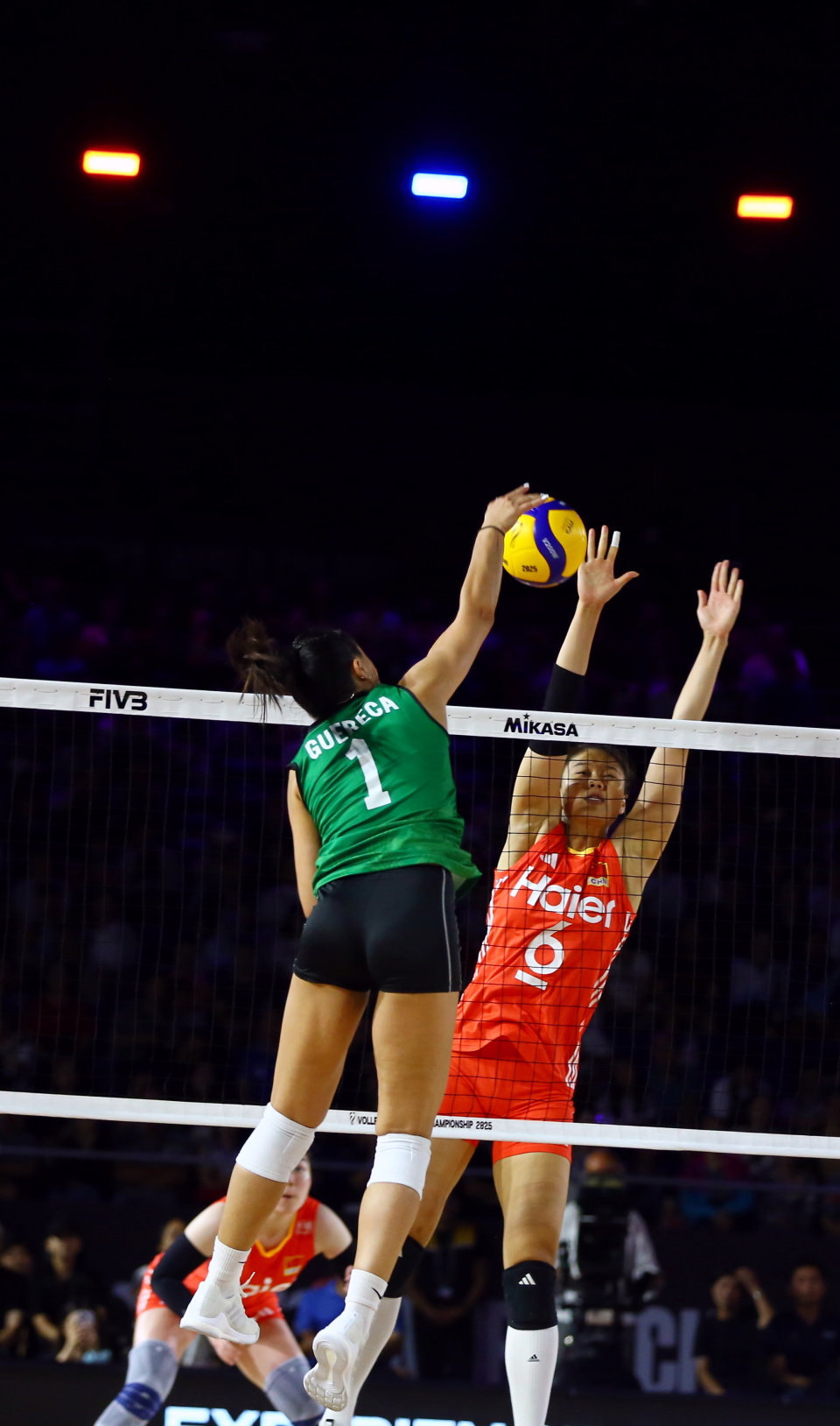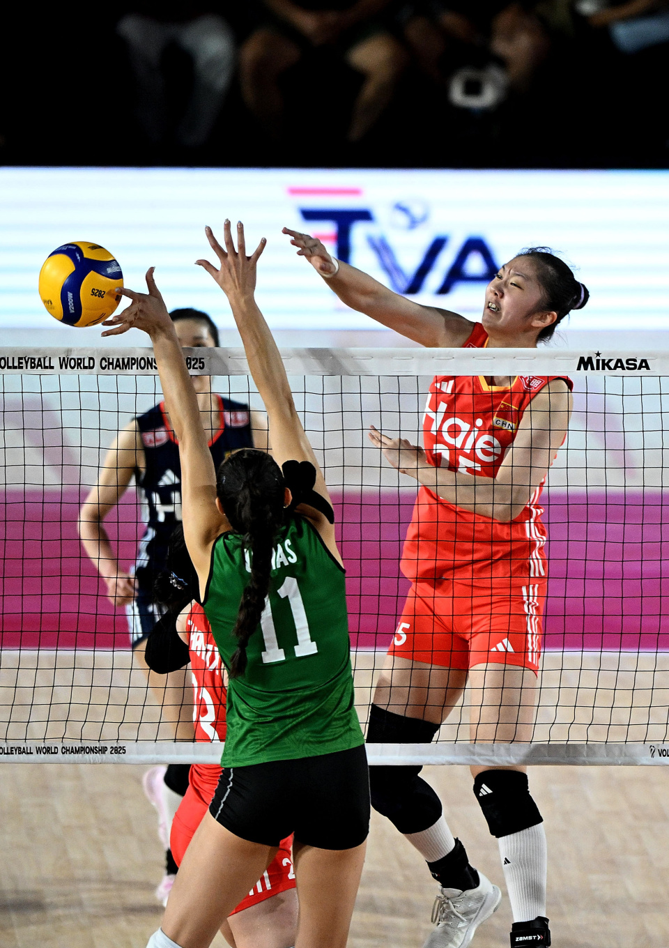 8月23日,中国队球员吴梦洁(左)在比赛中进攻。新华社记者 孙玮彤 摄