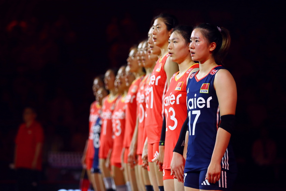 8月23日,中国队球员在赛前奏唱国歌仪式上。新华社记者 孙玮彤 摄