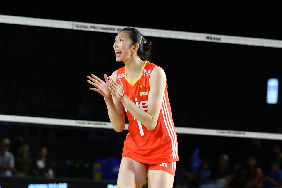 8月23日,中国队球员庄宇珊(右)在比赛中扣球。新华社记者 侯昭康 摄